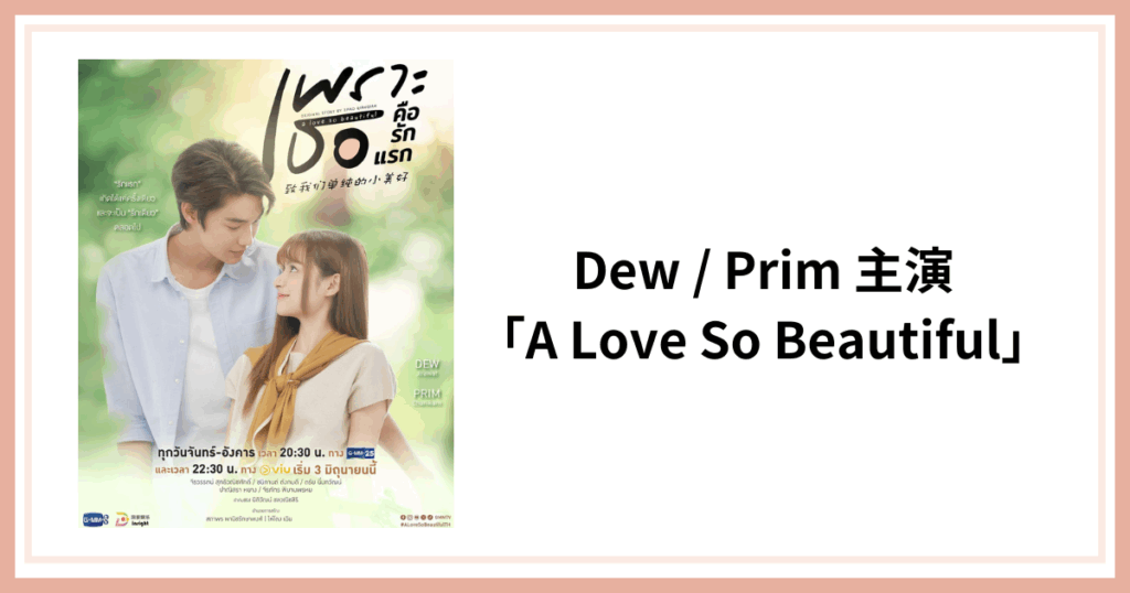2024年にGMM25にて放送された「A Love So Beautiful」。 DewとPrimが主演の幼なじみへの初恋を描いたロマンスドラマです。 そこで今回はタイドラマ「A Love So Beautiful」のあらすじやキャスト、どこで観られる?といった配信情報などを紹介します。 この記事を参考にドラマを楽しんでください。 -